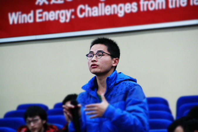 讲座最后的提问互动环节,在阴冷的天气中显得格外热烈,同学们纷纷抢着提问发言,使得该环节时间不断延长但仍然无法满足同学们对世界尖端风能技术的求知欲。